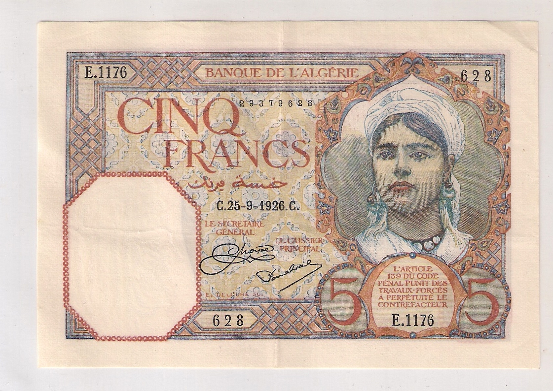 5 Francs Algérie 25.09.1926.