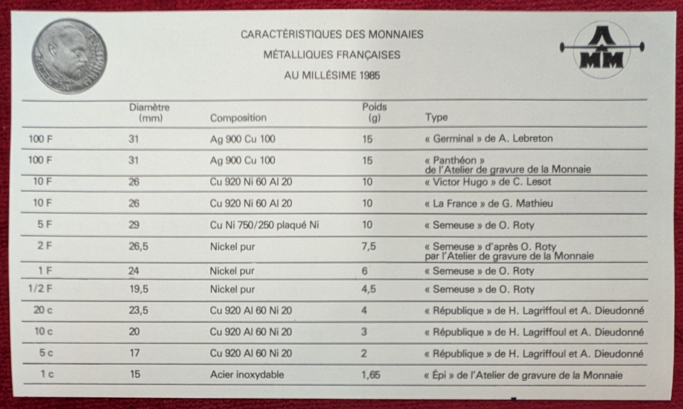 Coffret Francs 1985. FDC. Fleur de Coin.